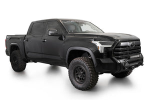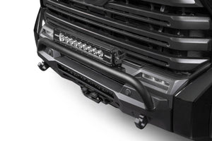 Our Front Bumper features a top hoop with integrated light mounts for running one 20” light bar or two pod lights. The front bumper also provides a center 20” light bar mount. The bumper offers a pair of 1” thick D-ring mounts and an optional Winch Kit for running up to a Warn Evo winch. Our front bumper is made from steel, and is finished in a dual-stage hammer black powder coat with satin black accent panels. It retains the factory parking sensors and fog lights. The bumper can be paired with our removable Aluminum Skid Plate. Made in the USA.