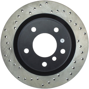 StopTech Drilled Sport Rotors are 1-piece direct replacement brake discs for factory brake systems and stock calipers that look great behind your wheels – and offer significantly improved braking performance. The unique cross-drilling aids with heat and brake dust dispersal; prevents glazing of the pads; adds bite and improves wet and dry braking performance. Built to last; the black e-coating provides protection from corrosion and the high carbon metallurgy (in most applications) offers quieter operation; better crack resistance and increased performance.