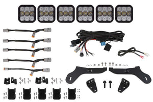 Included in the box: Two (2) Application-specific heavy-duty steel brackets. Two (2) Low mount heavy-duty steel brackets. Six (6) Stage Series 5 inch LED Pods. One (1) Heavy-duty single-output 4-pin wiring harness or One (1) Ultra heavy-duty single-output 4-pin wiring harness. Five (5) Heavy-duty CrossLink splitter wiring harnesses or Four (4) Ultra heavy-duty CrossLink splitter wiring harnesses and One (1) Ultra heavy-duty terminating wiring harness. One (1) CrossLink endmount kit. Five (5) CrossLinks with hardware. Installation Guide. Installation Instructions