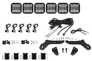 Included in the box: Two (2) Application-specific heavy-duty steel brackets. Two (2) Low mount heavy-duty steel brackets. Six (6) Stage Series 5 inch LED Pods. One (1) Heavy-duty single-output 4-pin wiring harness or One (1) Ultra heavy-duty single-output 4-pin wiring harness. Five (5) Heavy-duty CrossLink splitter wiring harnesses or Four (4) Ultra heavy-duty CrossLink splitter wiring harnesses and One (1) Ultra heavy-duty terminating wiring harness. One (1) CrossLink endmount kit. Five (5) CrossLinks with hardware. Installation Guide.