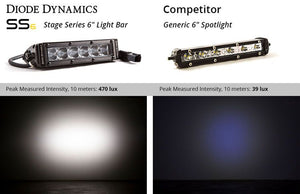 White or Amber. All Stage Series light bars are available in a cool white or amber color. The white is a 6000K color temperature, which is a true white output, without any blue. The amber is a brilliant deep yellow color, perfect for hazards or high contrast in poor weather. The SS6 Stage Series 6" Amber Light Bar can be found here.