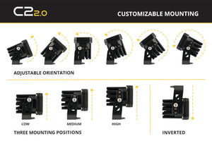Customizable Mounting. The C2 2.0 LED pod features three mounting points to adjust the pod’s height. The revised mounting bracket also allows for even more adjustment to the angle of the pod for a more dialed-in setup.