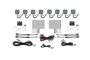 Included in the box: Eight (8) Stage Series RGBW Rock Lights One (1) Rock Light RGBW Wiring Harness Eight (8) Rock Light Tube Mount Adapters One (1) 1M Extension Four (4) 3M Extensions Three (3) 5M Extensions Twenty-Four (24) Zip Ties Installation guide