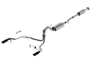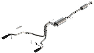 The Borla(r) Cat-Back(tm) system 140865BC was specifically designed to enhance the power and sound of the Ford F-150 equipped with the 5.0L V8 engine. It includes black chromed T-304 stainless steel tips and a split rear exit configuration. The entire system is made of T-304 stainless steel and utilizes computer numerical control (CNC) manufacturing techniques that ensure an accurate fit. This system features the "Touring" sound that gives you a mild sound of power with no drone. It is also available with bright chromed tips (part number 140865). There are additional systems available for the 5.0L F-150 that offer different options for sound level, tip finish and tip exits. All this is backed by our unsurpassed Million Mile Warranty., System Features:, Cat-Back(tm) System, Split Rear Exit, Black Chrome On T-304 Stainless Steel Tips, Touring Sound Level, T-304 Stainless Steel Construction, Bolt-On Installation, Million Mile Warranty