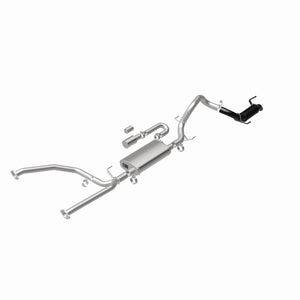 The MagnaFlow Toyota Sequoia Overland Series Cat-Back Performance Exhaust System #19625 offers the improved off-road capabilities, higher ground clearance, dyno-proven performance and signature MagnaFlow sound necessary to turn your 2023-2024 Toyota Sequoia into the ultimate overlanding vehicle. #19625’s direct-fit design is easy to install and replaces your SUV’s stock exhaust components from near the catalytic converter on back. This Toyota Sequoia exhaust system features 3” mandrel bent main piping that passes through a 22” oval bodied muffler and 11” round bodied muffler in addition to an NDT (No Drone Technology) reflection chamber before ending in a high clearance, tucked black-coated tailpipe to the rear of the driver’s side. The integration of MagnaFlow’s NDT technology means that droning noises at highway cruising speeds are kept to a minimum. One of the system’s mufflers features an accessory port, where various included modules can be attached to further augment your rig’s engine sound. An additional NDT resonator module can be attached for further droning reduction in various frequency ranges, or the port can be covered with the included pipe cap for a more traditional MagnaFlow exhaust sound. Together with the included J-pipe module, these attachments can be combined in various configurations to tune out a variety of different droning frequencies. The high clearance nature of the design and tucked exit of this system means both improved ground clearance and departure angles for superior off-road performance. This performance exhaust kit is made of durable, corrosion resistant stainless steel and produced using advanced CNC precision robotic manufacturing techniques, all backed by MagnaFlow’s limited lifetime warranty.