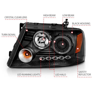 ANZO 2004-2008 Ford F-150 Projector Headlights w/ Halo and LED Black G2 - 111204