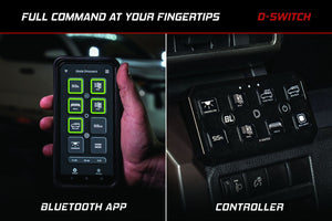 Fast, Responsive Bluetooth App. To activate and use the D-Switch, you can use the included controller, or control it using your phone through the Bluetooth App. That’s where you’ll configure and customize things as well. Say goodbye to switch panel apps that lag, freeze, or don’t connect. The D-Switch Bluetooth app for iOS and Android delivers instant response and easy programming with no loading screens or connection delays for a seamless and fast experience, every time. The app allows you to pair up to four individual D-Switch units for ultimate control over your entire setup.