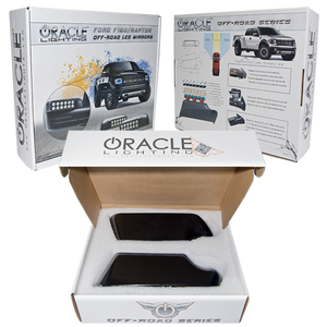 This innovative new product from ORACLE Lighting features a set of high powered LED light bars integrated into the factory-style side mirrors caps of Late Model Ford F-150 and Raptor Models. This integration allows for easy installation and a clean, almost OEM look while providing functional peripheral illumination for the driver. Why is peripheral illumination important Factory headlights and most auxiliary lights only illuminate the area in front of the vehicle. Ideally for off-road activities, such as trail riding, the driver needs to be able to clearly see the area on the sides of the trail to spot obstructions, which would otherwise go unnoticed and could be a potential hazard. Besides being functional these new LED Mirrors from ORACLE Lighting look great as well! The LED light bar is a custom design that features a total of 24 powerful Cree LEDs. This gives the driver a increased visibility and peripheral illumination. Each unit has a 45 beam angle to optimize the driver's peripheral visibility weather riding on the trail or in the desert. Multiple aluminum heat sinks are used to effectively wick heat away from the LEDs and are designed to use the airflow through the mirror housing to increase cooling similar to a radiator. The housing material is made from rugged Polycarbonate and bolts onto the vehicle using the factory mounts for easy installation. A set of anodized rock guards protects the LED acrylic lenses, which also houses the DBM Reflex LED optics. These efficient optics focus the light for optimal visibility from the driver seat position. Note: Will not fit Tow-Mirror equipped vehicles.