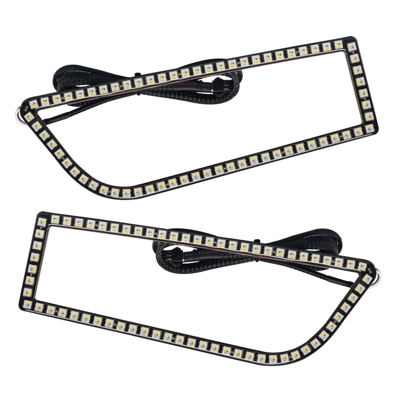 Customize your offroad adventure with head-turning LED styling from ORACLE Lighting! The Dynamic RGB+A headlight halo kit for the 2014-2021 Polaris RZR 900, 1000, XP, Turbo, and Turbo S models features our expertly-crafted surface-mount waterproof design and our Dynamic ColorSHIFT(tm) RGB+A technology for brilliant chasing colors and turn signal functionality with the best quality LED components. Encased in a special polymer resin, our surface mount halos are completely waterproof, and they easily install by attaching directly to the exterior of the headlight lens using a patent-pending system. We also use advanced LED chips that produce an impressively bright output while consuming less power. This simple process cuts down installation time from hours to just minutes! No removing the headlights, no baking the lights, no cutting the lights! The latest advancement in our expansive lighting modifications, our Dynamic ColorSHIFT(tm) technology allows the user to run multi-color moving patterns. Conveniently controlled through a free smartphone app, the system features over 200 pre-programmed moving patterns as well as static color control and white mode for normal street driving. In addition to the pre-programmed features, the user can also create custom designs through pixel editing in the app. The new RGB+A (RGB+ Amber LED) SWITCHBACK line-up features Amber LEDs creating the exclusive dynamic FLOW turn signal effect. These vividly eye-catching lighting effects are sure to wow any car enthusiast, and the chasing RGB halos are made stress-free by our surface-mount installation and plug-and-play wiring. Connect the ring terminals to the + and - battery terminals, then control your lights with the smartphone app from the included Dynamic ColorSHIFT(tm) controller. Using the latest lighting technology, our cutting-edge halo kits for cars are a great way to personalize your ride with show-stopping looks and industry-leading performance.