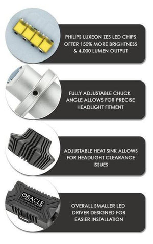 These new high-output LED Headlight bulbs create a 4,000Lm blanket of light for the driver to increase safety and nighttime visibility. Philips Luxeon ZES chips allow for the increased Lumen output while still drawing less than half the power of the factory headlight bulb. These smaller chips also have excellent heat dissipation characteristics, making them extremely reliable even in harsh environments. The new internal driver components were designed by Samsung and offer excellent performance in a smaller package. The new adjustable heat sink makes fitment issues a thing of the past since it is removable to reverse install or mount outside the headlight back-cap for added adaptability. More illumination, increased reliability, and easier installation all for LESS than before!