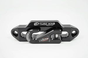 The Capture fairlead system holds your hook in place when not in use, giving you the ultimate form and function. Our hook capture system keeps your hook from dangling outside your vehicle making a clean and low profile front end. Built from 1 5/16" thick CNC machined high quality aerospace aluminum the Capture fairlead is rated for up to 20,000 lbs to help with all your winching needs. Available in raw aluminum or a military grade hard anodized black finish to withstand everyday use. Fits nearly any aftermarket winch front bumper. For synthetic winch rope only.