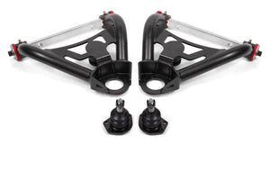 Fits 1964-1972 GM A-Body;Eliminates upper A-arm deflection;Improves steering feel and response for normal and performance driving;Increased high-speed stability;Laser-cut, CNC-formed plate steel braces for extra strength;Fixture welded for precise fit;Dual-offset cross-shafts for minimizing shim stack;Requires less shim stack for negative camber than OE arms;Internally fluted, high durometer polyurethane bushings;Two additional degrees of positive caster built into A-arms;Adds additional headers clearance;Pre-assembled with new polyurethane bumpstops;Includes new upper ball joints;Durable powdercoat finish;Proudly made in the U.S.A.