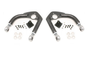 A-arms are one of the most important, yet overlooked suspension components. They are the direct link between the front wheels and the chassis. Any deflection causes a change in alignment, which results in poor performance and driving feel. Fabricated from heavy-duty 1.25-inch, 0.095-inch wall DOM tubing with laser-cut, CNC-formed plate steel plate, deflection is eliminated with A-arms from BMR Suspension. BMRs AA004 Upper A-arms come with new upper ball joints and heavy-duty rod ends, which add a solid, more responsive feel over the stock rubber bushings. BMRs uses zinc-plated, X-series, heat-treated, chrome-moly, self-lubricating, Teflon-lined rod ends, giving you the ultimate is strength and reliability.BMRs AA004 Upper A-arms reduce weight and eliminate upper A-arm deflection, greatly improving steering feel and response in normal and performance driving situations. The rod ends add strength and eliminate deflection over the stock rubber bushing. The means you get a great performance and loads of adjustability for street performance, drag race, and handling applications. The AA004s feature a 3 degree improved ball joint angle for lowered cars. These are compatible with all stock components. The adjustable design allows for precise caster and camber settingsBMR Suspension AA004 Adjustable Upper A-arms are available in black hammertone and red powdercoat for long-lasting good looks. Installation time is 3-4 hours. Proudly made in the U.S.A.Control arm hardware kit RH012 (Includes upper and lower control arm hardware - Highly Recommended) also available.