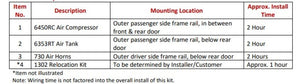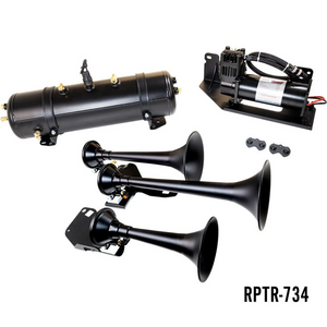 The RPTR-734 Onboard Air System with the Demon Model 730 Triple Train Horn is 100% Bolt-On and features a high output Kleinn waterproof air compressor and a Cortec inner coated 2.8-gallon air tank mounted on a custom, Made in the USA, mounting bracket. Using common hand tools, anyone can install their own onboard air system and train horn all without drilling a single hole! Includes a quick connect 30 foot tire inflator with remote mount and storage bag. Everything needed comes in one box for a professional & flawless installation. Kleinn vehicle specific train horn kits are also available as a stand alone onboard air system without a horn. The kit can be upgraded with the P/N 6890 Ultra Blastmaster Valve Upgrade to make the horns even LOUDER! Will not work with OEM powered side steps or F-150.  It is compatible with AMP Research Steps.
