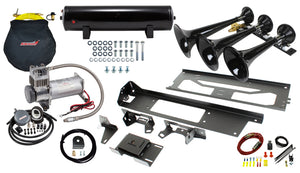 The SDKIT17-230 includes The Beast 230 Triple ABS Train Horns, a heavy duty 100% duty cycle waterproof air compressor, 3-gallon air tank and every part needed for simple, bolt-on installation on Ford Super Duty diesel trucks. Can be upgraded to be even louder by adding a P/N 6885 BlastMaster Valve Upgrade Kit. System also includes a quick connect tire inflator with 30 foot air hose and storage bag.