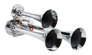 Want a train horn on your car but don't have the space The Model 130 triple air horn delivers devastating sound with compact, easy to install construction. This air horn can fit in almost any vehicle and deliver the big time loud air horn sound you need. Easy to fit, glistening chrome finish and extreme sound. These loud air horns are the complete package Installation Instructions Installation Instructions
