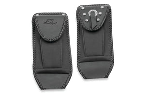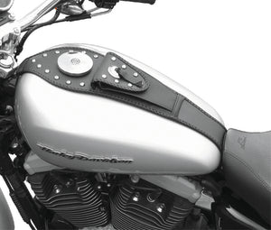 Contoured to hug the tank and felt-backed to protect the paint, Tank Bibs feature braided edges for unique style and utilize stock mounts for easy installation. Decorative studs are chrome-plated brass, not steel, and will never rust. Conchos are custom made from heavy die-cast zinc rather than thin stamping, and are hand-tied with genuine leather straps.