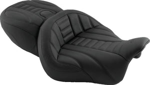 This updated version of Mustang's top-selling DayTripper platform sits riders lower and slightly further back compared to stock and features an all-new "Apex" chevron-style stitch design on the highly durable, synthetic glove-leather cover for a true custom look. The 12" wide driver bucket is cut low to place the rider in a relaxed operating position, while the 7-1/2" rear section maintains a streamlined profile while delivering ample comfort for passengers.
