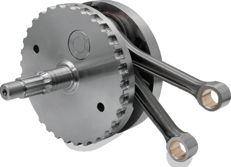 This 4-5/8" stroke 8-1/2" diameter flywheel assembly fits 2000-'06 internally balanced HD® big twin models as part of an S&S® 124" Hot Set Up Kit®. Sprocket shaft does not have a stock style bearing race pressed on. This flywheel assembly is for crankcases with Timken® sprocket shaft bearing. Flywheel assembly is three piece design. Pinion and sprocket shafts are forged as part of the flywheel. Assembly is trued to less than .0005" runout on pinion and sprocket shaft bearing surfaces, making them capable of higher rpm and fully compatible with gear drive cams.