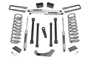Give your Dodge an aggressive look from front to rear with Rough CountryΓÇÖs 5" Dodge Suspension Lift Kit! This easy-to-install leveling kit raises the front of your vehicle to be equal height with the rear for a leveled, flush look that gives a better ride height and more aggressive appearance.\This kit features a set of front, durable coil springs allowing you gain additional ride height without sacrificing ride quality or performance. A set of track bar relocation bracket and control arms are provided to keep everything at optimum angles for a factory-like ride, even after lifting. Our fabricated rear blocks offer considerably more strength than their cast iron counterparts.\A set of Rough Country's premium N3 shocks are also included in this kit. These fine tuned 10-stage variable high-pressure Nitrogen charged shocks offer a fantastic blend of off-road action and smooth highway ride quality. With a durable 18mm spring-loaded piston rod and faster-cooling 54mm shock body.\Get the wheels you want! Rough Country's 5" Dodge Suspension Lift Kit comes with everything you need to fit up to a 35" tire with proper wheel backspacing.\Best of all, Rough Country's 5" Dodge Suspension Lift Kit is backed by our Lifetime Replacement Warranty.