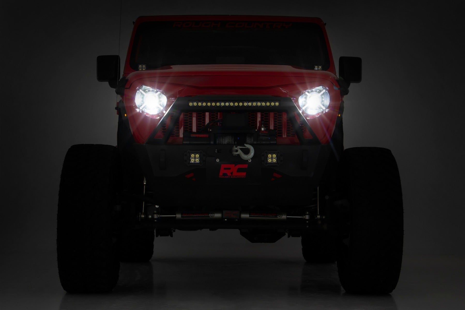 See more of the road ahead while giving your Jeep an aggressive look with Rough CountryΓÇÖs DOT-certified 9in LED Projection Headlights. These easy-to-install headlights offer incredible illumination while transforming the look of your front-end.\Rough CountryΓÇÖs LED Projection Headlights are DOT/SAE certified to be street legal, and feature a durable IP67 waterproof housing for a long lifespan of illumination. Each headlight kit features a 100% bolt-on installation process and includes a handy adapter for easy plug-and-play setup.\With 100 watt / 6500 lumen high beams and 30 watt / 3000 lumen low beams, Rough CountryΓÇÖs 9-Inch LED Projection Headlights offer plenty of illumination. The black interior design and ΓÇ£XΓÇ¥ design lamp housing gives the headlight an interesting look that dresses up your front-end design.