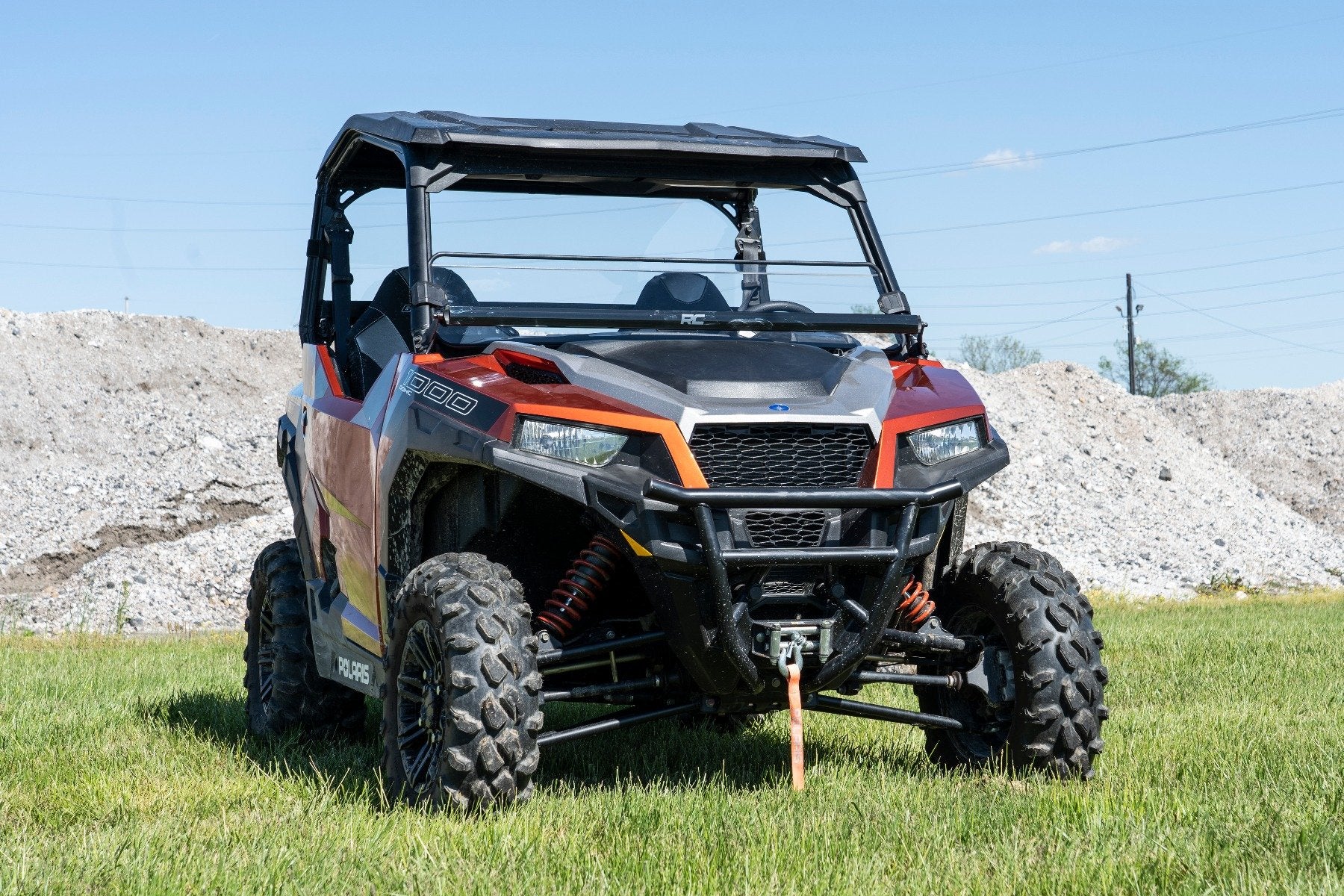 Added Protection and comfortability. Protect the occupants of your Polaris General from off-road hazards such as rocks, branches, and other debris with Rough Country's Scratch-Resistant Windshields. UTV Windshields offer a clear visual of the trail ahead and allow for a much more comfortable outing!\High-Quality Polycarbonate Construction. Rough Country UTV windshields are constructed from thick polycarbonate material that is precision cut for a perfect fit.  The polycarbonate material provides an ideal combination of clarity, flexibility, durability that outperforms glass, acrylic, and other windshield materials. \Durable Scratch and UV Resistance. Each windshield is not only constructed from thick polycarbonate material but enhanced by a secondary AR2 hard-coating process.  This process completely coats the windshield with a hardened, scratch-resistant barrier.  This treatment also provides the additional benefit of UV protection.\Easy Installation. With a simple strap-on installation process, installing a Rough Country windshield couldn't be easier.  Within 15 – 30 mins you can be ready to hit the trails.  \Limited-Lifetime Replacement Warranty. Rough Country's Scratch-Resistant Windshields are backed with a limited lifetime replacement warranty towards manufacturer defects. As such, the product is protected from structural and workmanship damage after the date of purchase. With our industry-leading warranty give yourself peace of mind when using Rough Country's Suspension products!