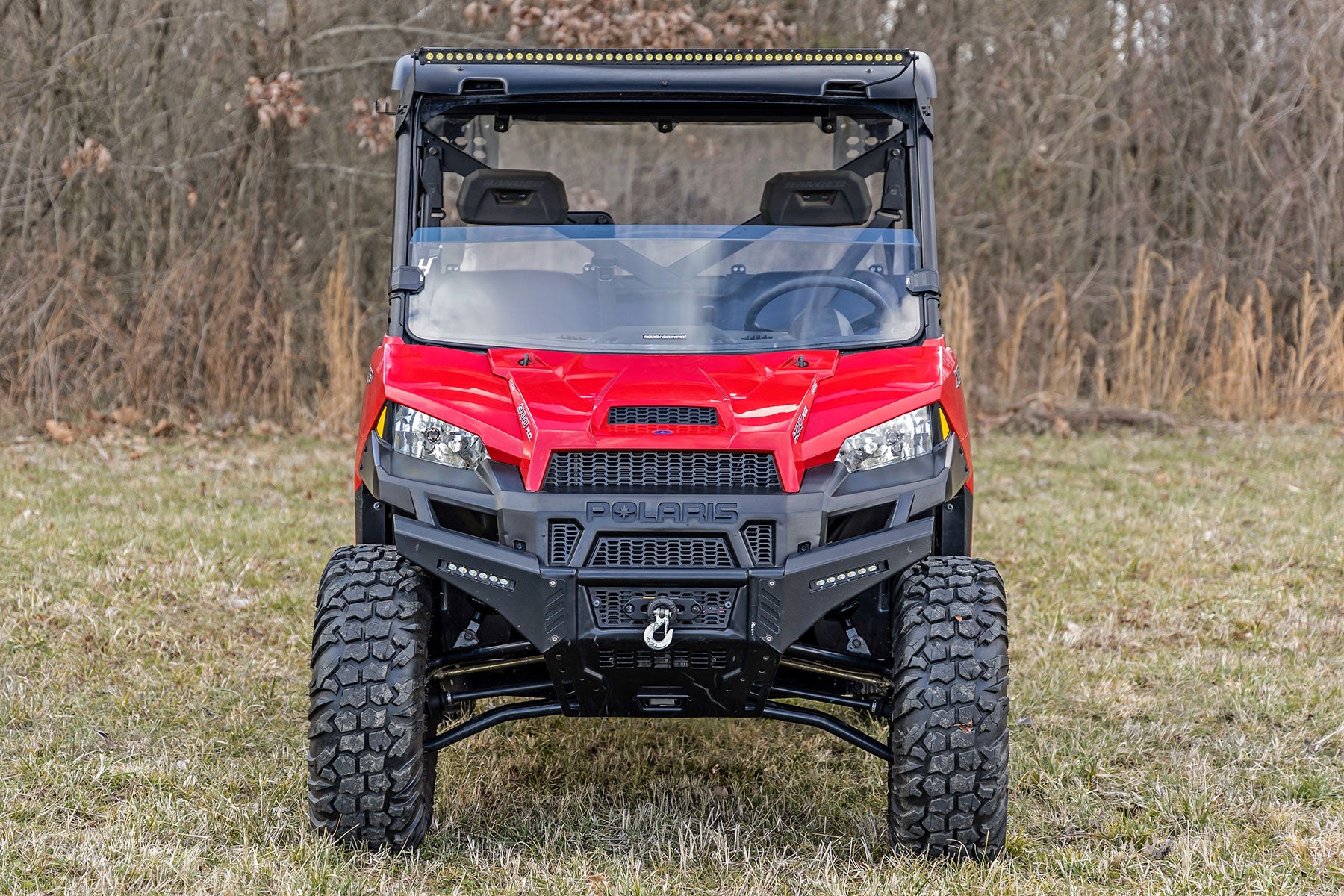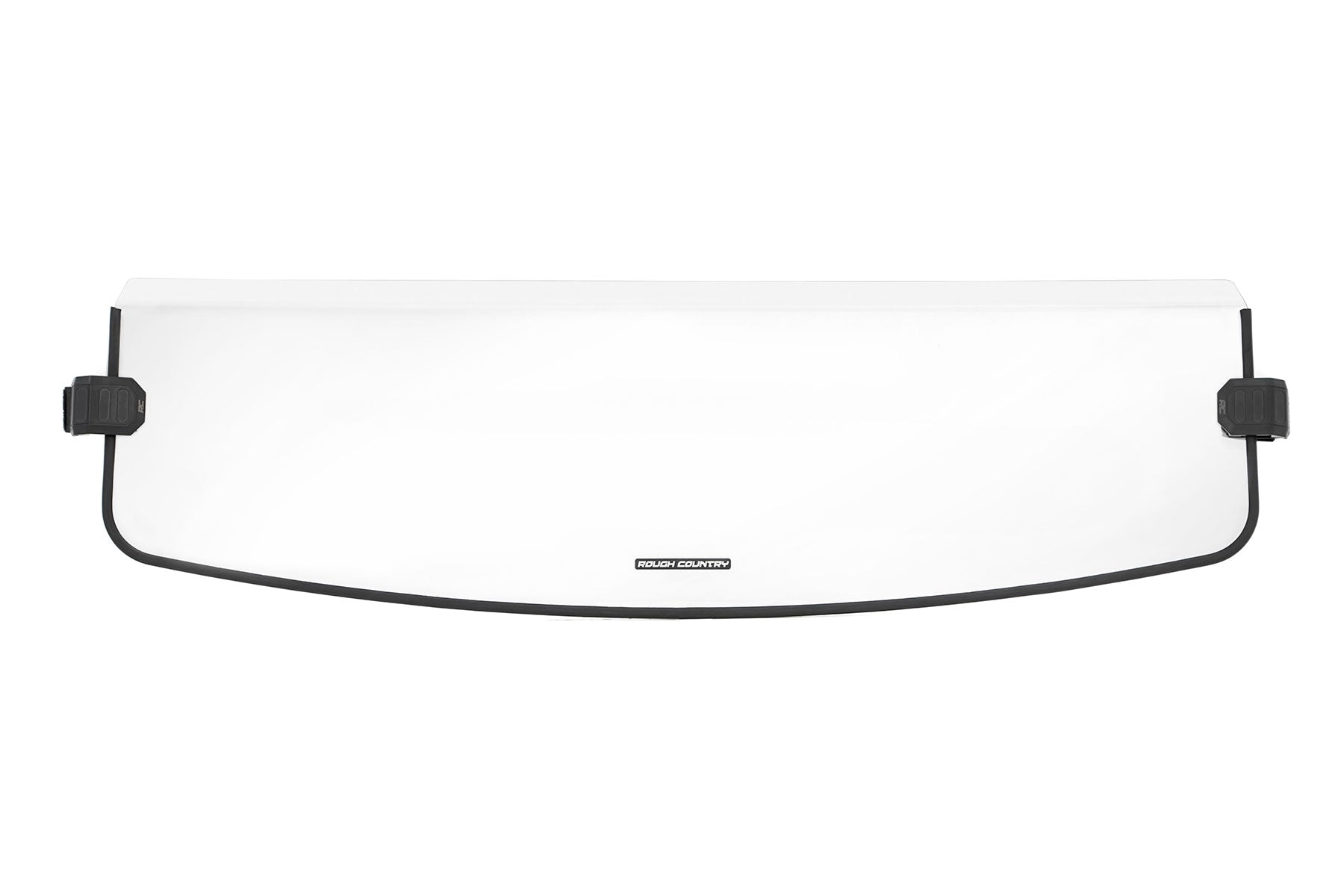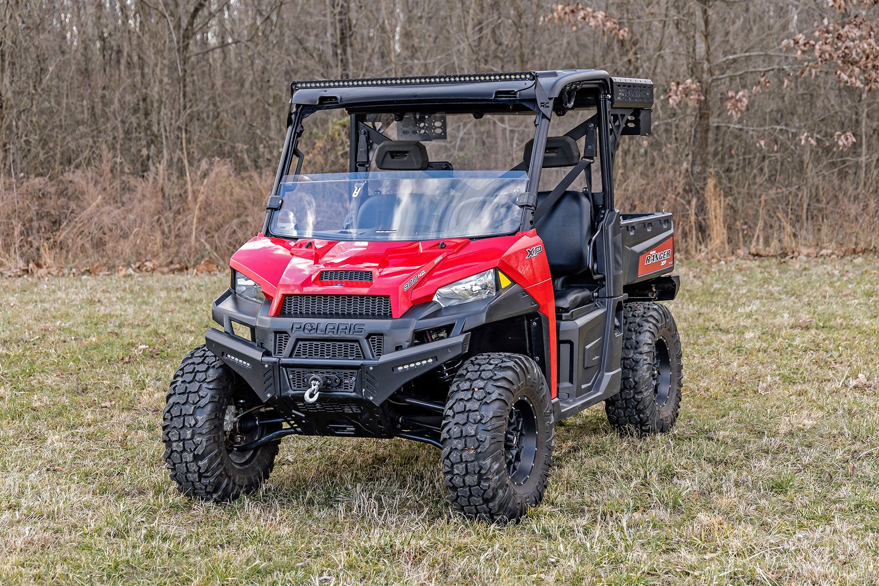 Added Protection and comfortability. Protect the occupants of your Polaris Ranger from off-road hazards such as rocks, branches, and other debris with Rough Country's Scratch-Resistant Windshields. UTV Windshields offer a clear visual of the trail ahead and allow for a much more comfortable outing!\High-Quality Polycarbonate Construction. Rough Country UTV windshields are constructed from thick polycarbonate material that is precision cut for a perfect fit. The polycarbonate material provides an ideal combination of clarity, flexibility, durability that outperforms glass, acrylic, and other windshield materials.\Durable Scratch and UV Resistance. Each windshield is not only constructed from thick polycarbonate material but enhanced by a secondary AR2 hard-coating process. This process completely coats the windshield with a hardened, scratch-resistant barrier. This treatment also provides the additional benefit of UV protection.\Easy Installation. With a simple strap-on installation process, installing a Rough Country windshield couldn't be easier. Within 15 ΓÇô 30 mins you can be ready to hit the trails.\Limited-Lifetime Replacement Warranty. Rough Country's Scratch-Resistant Windshields are backed with a limited lifetime replacement warranty towards manufacturer defects. As such, the product is protected from structural and workmanship damage after the date of purchase. With our industry-leading warranty give yourself peace of mind when using Rough Country's Suspension products!
