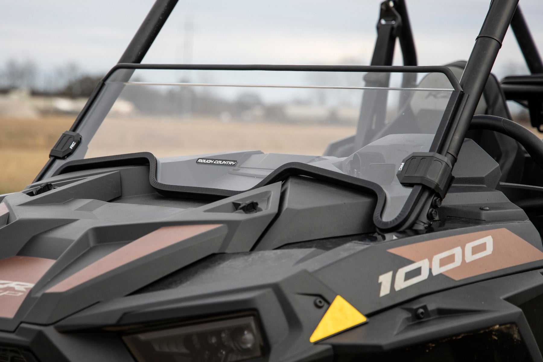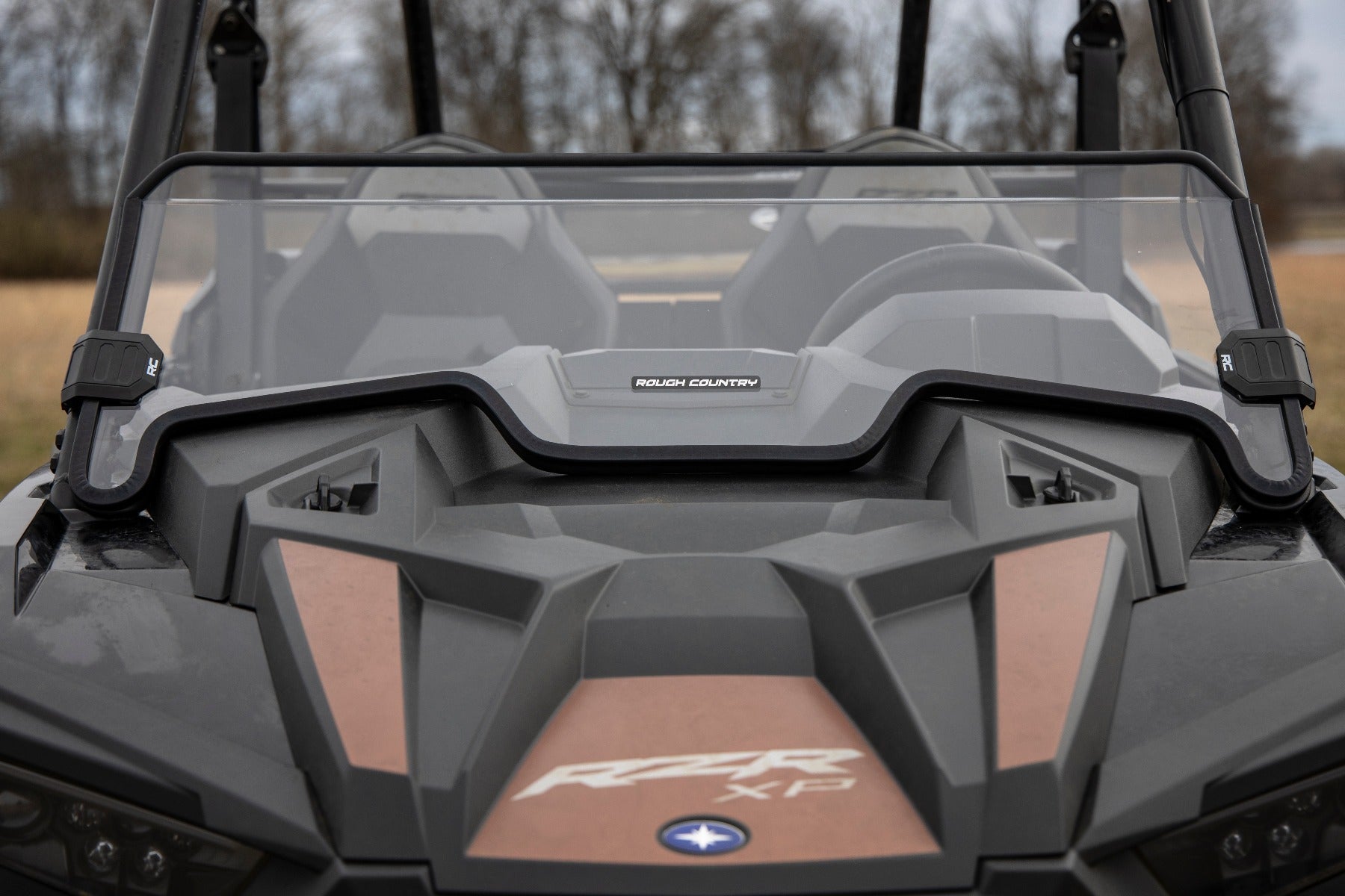 Added Protection and comfortability. Protect the occupants of your Polaris RZR from off-road hazards such as rocks, branches, and other debris with Rough Country's Scratch-Resistant Windshields. UTV Windshields offer a clear visual of the trail ahead and allow for a much more comfortable outing!\High-Quality Polycarbonate Construction. Rough Country UTV windshields are constructed from thick polycarbonate material that is precision cut for a perfect fit. The polycarbonate material provides an ideal combination of clarity, flexibility, durability that outperforms glass, acrylic, and other windshield materials.\Durable Scratch and UV Resistance. Each windshield is not only constructed from thick polycarbonate material but enhanced by a secondary AR2 hard-coating process. This process completely coats the windshield with a hardened, scratch-resistant barrier. This treatment also provides the additional benefit of UV protection.\Easy Installation. With a simple strap-on installation process, installing a Rough Country windshield couldn't be easier. Within 15 ΓÇô 30 mins you can be ready to hit the trails.\Limited-Lifetime Replacement Warranty. Rough Country's Scratch-Resistant Windshields are backed with a limited lifetime replacement warranty towards manufacturer defects. As such, the product is protected from structural and workmanship damage after the date of purchase. With our industry-leading warranty give yourself peace of mind when using Rough Country's Suspension products!
