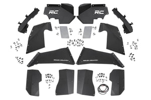 Clean up the look of your inner fenders when using aftermarket flares with Rough CountryΓÇÖs JK Front and Rear Inner Fender Liners. These eye-catching inner fender upgrades help protect sensitive areas from dust, mud, and debris, and can be easily installed in no-time flat! Aftermarket fenders are a huge improvement for most Jeeps wanting to get the best clearance and articulation possible, but when removing the stock fenders many people also remove the stock fender liners. Regain protection in this crucial area and protect your engine bay from the elements with Rough CountryΓÇÖs innovative Front and Rear Inner Fender Liners. With a unique 3-piece construction, these liners cover more areas than other liners on the market, giving more protection to your engine bay and body panels. Each Rough Country liner features a corrosion-resistant powder coat for long-lasting durability. Additionally, these liners mount firmly to the body for quiet operation, free of rattling or vibration noise. The solid-steel, angular design with ΓÇ£RCΓÇ¥ and ΓÇ£Rough CountryΓÇ¥ logo cutouts gives an aggressive look to this now more visible area on your JK. An included, removable logo plate for the front liner can be custom painted to any color you wish for a pop of extra color, while the rear liner lines up perfectly to show the painted body color behind it. Rough Country Inner Fender Liners feature a bolt-on installation process with minor drilling for an easy upgrade you can do with common tools in a home garage. Includes Rough CountryΓÇÖs Lifetime Replacement Warranty.