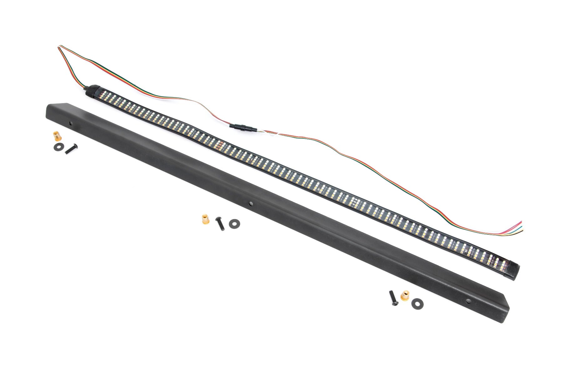 Take your Can-Am's functionality to new levels with Rough Country’s Quad-Row Multifunction LED Tailgate Light Strip. This LED Light Strip has multiple modes, with a series of red and white LED’s all tied into the same strip. This tailgate upgrade offers bright and dim red light options, white reverse lights, and half-panel red turn signals.\With 288 LED's, this flexible strip adds increased driving capabilities in the dark. Whether you find yourself on the trails off-roading at night or getting the work done first thing before the sun comes up, Rough Country’s Can-Am Defender Multi-Function LED Tailgate Light Strip has you covered.\These Multifunction LED Tailgate Light Strips are easy to install and wire in to your UTV’s factory wiring harness for immediate use. The LED strip itself adheres with a strip of pre-installed 3M automotive-grade adhesive padding that goes on fast and stays put. These handy tailgate LED Lights attached to the included L-bracket that installs under the tailgate of your Defender. Each Multi-Function Tailgate LED strip features an IP68 Waterproof design, guaranteed to resist dust and even prolonged water immersion. Includes Rough Country’s 3-year limited Warranty.