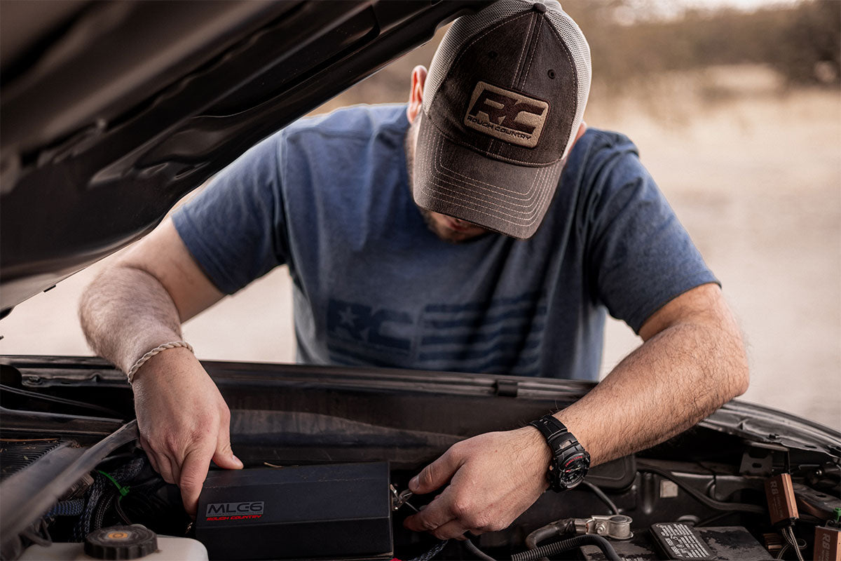 Rep your Rough Country pride with this stylish and comfortable embroidered mesh hat by Rough Country. This low-profile, structured, trucker cap features a contoured bill and front panel with mesh rear for a comfortable fit and excellent airflow. The heavy cotton twill panels and bill are pre-shaped and curved for a durable long life. The stylish contrasting stitch pattern offers a great look, while the snap back strip offers plenty of adjustability for any wearer. Features an embroidered ΓÇ£RCΓÇ¥ logo patch for killer good looks!