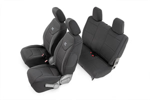 Want to protect your seats or are your seats showing signs of wear and tear from daily use? Say goodbye to unsightly stains and deterioration with Rough Country's Neoprene Seat Covers - the ultimate solution for preserving your vehicle's interior. Snug Fit for Optimal Protection: Our seat covers are tailored to fit your seats perfectly, providing a protective barrier against spills, scratches, and everyday wear and tear. Factory-Spec Construction: Engineered to meet factory specifications, our covers blend seamlessly with your vehicle's interior, giving it a fresh, new look without compromising on quality or style. Four-Layer Defense: With a four-layer construction featuring foam padding and a durable polyester shell, our seat covers offer unmatched protection and longevity, ensuring your seats stay looking new for years to come. Breathable and Water-Resistant: The neoprene layer not only provides breathability for added comfort but also boasts water-resistant properties, safeguarding your seats from spills and stains. Complete Coverage: Our covers come with full protection for your front seats, including headrest covers where applicable, as well as rear covers to shield your back seats from children and pet-related mishaps. Peace of Mind Warranty: Rest easy knowing your purchase is backed by our two-year warranty, giving you confidence in the durability and reliability of our product. Don't let worn-out seats diminish your driving experience. Upgrade to Neoprene Seat Covers today and enjoy a fresh, stylish interior that's protected against the rigors of daily life on the road.