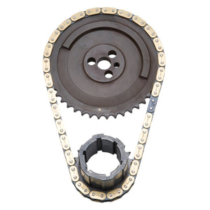 Edelbrock part #7343 RPM-Link adjustable true-roller timing chain Set now, you can dial-in your camshaft with ease with our RPM-Link Roller Timing Chain Set. RPM-Link timing chain bolt onto your engine just like any other timing chain set, so there's no machining required and no need for special offset bushings for installation. Made from induction hardened billet steel, it allows for a quick cam timing adjustment to plus or minus six degrees- ? Performer roller chain sets are engineered to operate up to 6500 rpm.- ? Never hammer directly on chain or sprockets. You can crack the hardened links and pins and cause early failures. - ? Use a sleeve for installations that require hammering, a brass drift punch may be used if you carefully alternate blows on either side of the sprocket to avoid cocking. - ? Never stretch the chain with a screwdriver. - ? Check for clearance between the timing chain and block and between the chain and front cover before reassembly. - ? Be sure that both cam and crank sprockets are exactly in line with each other. Misalignment can cause chain to break