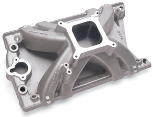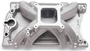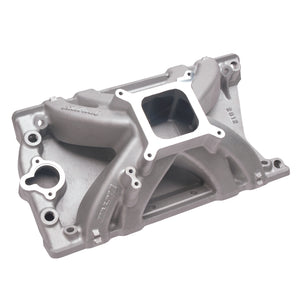 Edelbrock part #2812 Victor Oldsmobile intake manifold provides power levels never before available for competition single-carb 350-403 Olds engines. Featuring a single-plane "Air-Gap" design, it accepts square-bore carb and offers significant horsepower increases over existing intakes in the 4500 to 7500 rpm range. It features a carb mount pad height of 7" and high-flow constant area 3.2-square-inch runners. The runners have been optimized to match the flow characteristics of Edelbrock Performer RPM aluminum cylinder heads #60519 and the exit size, as-cast, is 1.28" by 1.94" with plenty of metal thickness for gasket matching and porting.