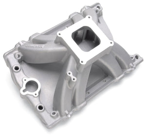 Edelbrock part #2810 Victor Oldsmobile 455 drag racing intake manifold provide power levels never before available for competition single-carb 455 Olds engines. In independent flow testing, our port-matched design out-flowed the best fully ported manifolds on the market. Featuring a single-plane "Air-Gap" design, they are available for square-bore or 4500 Series carbs to accommodate many competition applications, and offer significant horsepower increases over existing intakes in the 4500 to 7500 rpm range. With a carb mount pad height of 8.2", this manifold stand more than three inches taller than the Edelbrock Torker manifold and incorporate a high-flow 3.4-square-inch runner. We've removed the intake bolts between the runners, thus creating a smoother airflow path for higher airflow and more power! This intake manifold features a port size and shape that has been optimized to match the flow characteristics of Edelbrock Performer RPM #60519 aluminum cylinder heads.