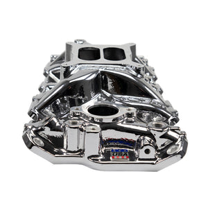 Edelbrock part #2701-CP Performer EPS intake manifold is for 1986 and earlier 262-400 cubic-inch Chevys. Design is optimized for Edelbrock EPS or AVS2 carburetors, although any 4150 style carburetor will fit. Edelbrock's Patented Dual-plane, low-rise design with a 180-degree firing order greatly improves torque over a wide rpm range for excellent throttle response. The Edelbrock Performer EPS intake manifold has a runner design that's "tuned" for peak torque at 3500 rpm on a 350-inch engine making it ideal for power from off-idle to 5500 rpm. Dyno tests showed gains of 5 hp and 9 ft-lbs. of torque over the Edelbrock Performer manifold #2101 on a 350 Chevy. This PN 2701-CP version comes with a brilliant Chrome plasma finish that is durable and easy to maintain.