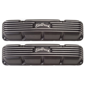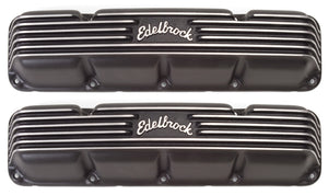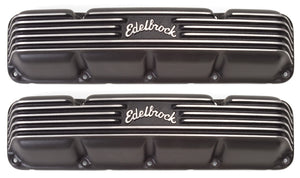 Edelbrock part #41993 Classic Series Valve Covers are designed for AMC/Jeep 290-401 V8 1967-91 applications and have a Black finish. Edelbrock first made these aluminum valve covers in the late '50s and they're still a classic. Made of heavy-gauge sand-cast aluminum, Overall height is measured from base to top at the highest point. Edelbrock classic valve covers can be machined to accept breathers if desired.