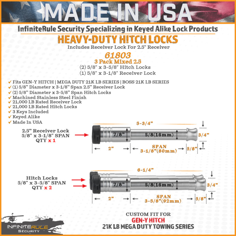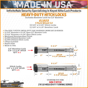 Gen-Y InfiniteRule (2) 5/8in x 3-5/8in Hitch Locks (1) 5/8in x 3-1/8in 2.5in Receiver Lock w/6 Keys - GH-103915