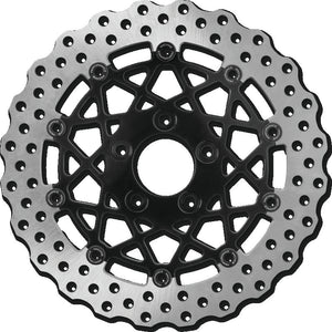 Performance Machine Speedstar Race Weight Full-Floating Brake Rotors are CNC precision machined to ensure a flat and parallel surface. Hardening the 420 stainless steel outer band to meet RC36 specifications, coupled with a full-floating design yields a rotor with a higher resistance to deformation. The wave cut braking surface is drilled in a sweep pattern for optimal heat dissipation with a reduction in weight. The inner carrier utilizes the increased strength of 7075-T6 aluminum for a lighter weight design while improving braking performance. The laser engraved PM logo on the floating elements will let everyone know you are serious about performance. Designed for use with most OEM and aftermarket wheels and calipers.