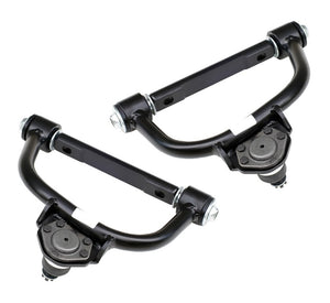 Front upper StrongArms for 1982-2003 S10 2WD. Includes a pair of tubular control arms with ball joints and delrin bushings. Powder coated satin black.