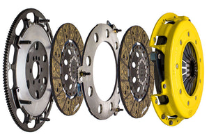 T3S-G02 street, twin disc kit offers twice the number of disc surfaces for better wear, heat capacity and long life compared to single disc kits. These kits use a proprietary Positive Lift Floater System design, which results in quiet operation with no floater rattle and no posts to wear. ACT twin disc kits endure an exclusive four-stage, heat-treating process on all diaphragms. The ACT twin disc features the ability to adjust for disc wear and provides equal disengagement for discs. The ACT Performance street rigid-hub discs feature premium organic materials with high copper content for better heat transfer and steel-backed lining for greater burst strength and durability. The chrome-moly hub is heat-treated for strength and durability. Rivet design and materials are carefully selected for maximum strength. All ACT twin disc kits include a CNC-machined and dynamically balanced flywheel to ensure trouble-free installation and operation. ACT twin disc kits include a pressure plate, two discs, a floater, flywheel and alignment tool. Some kits may included a pilot bearing and release bearing.