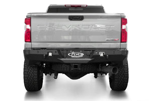 Our Phantom Rear Bumper is designed to prevent damage from rocks, shrubs, debris, and other off-road obstacles. The integrated pair of cube light mounts allow for improved lighting in dark or dusty conditions. A pair of 1-inch D-ring mounts provide vehicle recovery capabilities. The bumpers seamless fitment and sturdy design offers an aggressive styling that compliments your rig's exterior. The Phantom Rear Bumper is made from durable American steel, and the dual-stage hammer black powder coat and satin black aluminum accent panels offer a sleek finish. The bumper is designed to closely follow the contours of your truck, for a seamless fitment that also retains the OEM parking sensors and trailer plug & wiring. This ADD Offroad rear bumper is proudly made in the USA.
