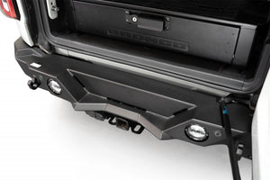 The Krawler Rear Bumper was designed for heavy trail use and features high clearance angles. Its low profile fitment and modern plate steel construction is well suited for rock crawling. Two 3-4-inch round light mounts provide options for supplemental rear lighting. The Krawler accommodates the OEM Tire Mount & back-up camera, as well as the factory hitch and trailer harness. Included with the bumper is a 3rd brake light extension bracket compatible with up to a 37-inch spare tire, and a license plate relocation bracket that mounts to the carrier. Recovery options include heavily reinforced clevis mounts for ¾-inch D-ring shackles. The bumper is finished in a hammer black powder coat, while its aluminum accent panels are finished in a satin black powder coat. As always, the Krawler is fully bolt-on and made in America.