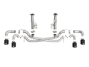 This cat-back exhaust system is constructed of 3" - 2-1/2" mandrel-bent brushed finished 304 stainless steel tubing for maximum strength and durability. Finishing off this exhaust system are quad 4-1/2" diameter black stainless steel clamp-on exhaust tips. The tips feature a laser etched aFe POWER logo for a unique style. This system produces an aggressive sound unleashing all available horsepower and torque. Utilizing factory style flanges and hangers this system is a direct bolt-on system, which requires no cutting or modifications for a hassle-free installation. This cat-back exhaust system uses a heavy duty flex pipe with an internal interlock liner for added strength and durability. A mitered merge x-pipe is used to balance and evenly distribute exhaust pulses traveling through the exhaust system, minimizing exhaust drone and maximizing scavenging. This axle-back exhaust system incorporates factory style AFM (active fuel management) exhaust valves which use the factory exhaust valve motors (not included). The AFM valves helps to control exhaust pulses during cylinder deactivation. Utilizing state-of-the-art computer-aided design technology, this exhaust system is designed for custom, high tolerance factory fitment. 100% TIG-Welded for race-proven strength and durability.
