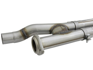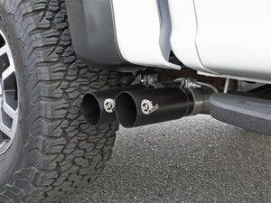 This Rebel Series cat-back is designed with dual black exhaust tips that exit in front of the rear passenger tire for a unique, aggressive look. The tips come with unique laser-etched aFe Power logos on the side and are constructed from stainless steel for durability. The exhaust system is constructed from 3" MIG-welded, mandrel bent stainless steel tubing for maximum flow, increased horsepower and torque. The performance cat-back exhaust system includes necessary hardware and clamps for a hassle-free install, with no cutting required making it a true bolt on system. 3-1/2" Dia. Black Middle-Side Exit Tips: Finishing off the exhaust are dual 3-1/2" diameter black 304 stainless steel clamp-on tips with a laser-etched aFe power logo on the side for an aggressive style. The tips are designed to exit from in front of the rear passenger side tire for a unique custom look. Installation Is A Snap: This Rebel Series exhaust system uses factory mounting locations providing stability and hassle-free installation. Leak-Free Seal: High quality band clamps are used for a complete 360-degree sealing surface eliminating leak paths. Aggressive Sound: A free-flowing stainless steel muffler is used to absorb high pitch tones producing a powerful sound and unleashing all available horsepower and torque. Perfect Fit: OE-style bayonet hangers are used to maintain a stable pipe location during high vibration and high heat conditions. The bayonet tip holds the ha nger bushing in place for an OE-style fit that does not change with time. This makes for an easy installation with no cutting required.