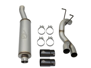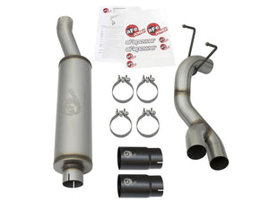 aFe POWER introduces an all new Rebel Series dual middle-side exit exhaust system for the 2014-2017 RAM 2500/3500 with V8-6.4L HEMI engine. This Rebel Series cat-back is designed with dual black exhaust tips that exit in front of the rear passenger tire for a unique, aggressive look. The tips come with unique laser-etched aFe POWER logos on the side and are constructed from 304 stainless steel for durability. The exhaust system is constructed from 3-1/2" MIG-welded, mandrel bent stainless steel tubing for maximum flow, increased horsepower and torque. This kit uses a free-flowing muffler to absorb high pitch tones producing a powerful sound. The performance cat-back exhaust system includes necessary hardware and clamps for a hassle-free install, with no cutting required making it a true bolt on system. 4" Dia. Black Middle-Side Exit Tips: Finishing off the exhaust are dual 4" diameter black 304 stainless steel clamp-on tips with a laser-etched aFe POWER logo on the side for an aggressive style. The tips are designed to exit from in front of the rear passenger side tire for a unique custom look. Installation Is A Snap: This Rebel Series exhaust system uses factory mounting locations providing stability and hassle-free installation. Leak-Free Seal: High quality band clamps are used for a complete 360-degree sealing surface eliminating leak paths. Aggressive Sound: A free-flowing stainless steel muffler is used to absorb high pitch tones producing a powerful sound and unleashing all available horsepower and torque. Perfect Fit: OE-style bayonet hangers are used to maintain a stable pipe location during high vibration and high heat conditions. The bayonet tip holds the hanger bushing in place for an OE-style fit that does not change with time. This makes for an easy installation with no cutting required.