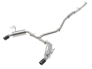This cat-back exhaust system is constructed of 2-1/2 IN - 2-1/4 IN mandrel-bent 304 stainless steel tubing for maximum strength and durability. This system features high-flow 304 stainless steel polished mufflers, producing a aggressive sound. The mufflers has a polished finish for ultimate corrosion resistance. Finishing off this exhaust system are dual 3-1/2 IN diameter carbon fiber 304 stainless steel clamp-on exhaust tips. The tips features an aFe POWER logo for a unique style. This system produces an aggressive sound unleashing all available horsepower and torque. Utilizing a factory style flange and hangers this system is a direct bolt-on system, which requires no cutting or modifications for a hassle-free installation. A mitered merge collector is used to decrease turbulence and increase exhaust velocity resulting in increased horsepower, torque and improved throttle response. State-of-the-art computer-aided design technology is utilized for precise vehicle fitment. 100% MIG-Welded for race-proven strength and durability.