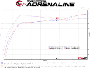 Performance Gains: This system produced gains of up to +6 HP and +5 lbs. x Ft. TQ., as measured on our in-house dyno.3" - 2-1/2" 304 Stainless Steel Construction: This cat-back exhaust system is constructed of 3" - 2-1/2" mandrel-bent, brushed finished 304 stainless steel tubing for maximum strength and durability.High-Flow 304 Stainless Steel Polished Mufflers: This system features high-flow 304 stainless steel polished mufflers, producing a smooth sound. The mufflers has a polished finish for ultimate corrosion resistance.Dual 4-1/2" Diameter Carbon Fiber Exhaust Tips: Finishing off this exhaust system are dual 4-1/2" diameter carbon fiber 304 stainless steel clamp-on exhaust tips. The tips features an aFe POWER logo for a unique style.Installation: Utilizing a factory style flange and hangers this system is a direct bolt-on system, which requires no cutting or modifications for a hassle-free installation.Integrated Mitered Merge Collector: A mitered merge collector is used to decrease turbulence and increase exhaust velocity resulting in increased horsepower, torque and improved throttle response.Computer-Aided Design: Utilizing state-of-the-art computer-aided design technology, this exhaust system is designed for custom, high tolerance factory fitment.TIG-Welded: 100% TIG-Welded for race-proven strength and durability.Emissions Disclaimer: This product does not require a CARB EO#.aFe POWER exhaust systems are engineered and manufactured in our Corona, California facility.