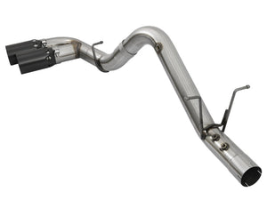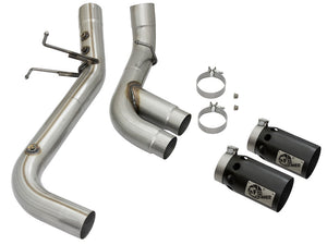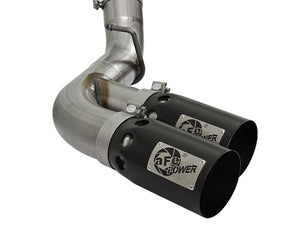 Simple Installation: All systems use factory mounting locations providing stability and hassle-free installation. Leak-Free Seal: High quality band clamps are included for a complete 360 degree sealing surface. OE Fit: OE-style bayonet hangers are used to maintain a stable pipe location during high vibration and high heat conditions. The bayonet tip holds the hanger bushing in place for an OE-style fit that does not change with time. Flow and Performance This exhaust system is constructed of 4" mandrel-bent stainless steel tubing for maximum flow. Smooth transition bends allow for low turbulence, increasing horsepower, torque and lowering EGT's. 5" Diameter Black Intercooled Tips: Finishing off the exhaust are 5" diameter, Hi-Temp black, stainless steel straight cut tips with intercooling vents designed to reduce exhaust gas temperatures at the tailpipe. A unique stainless steel laser-cut aFe Power logo plate is riveted on for an aggressive style. **Cutting stock exhaust is required.