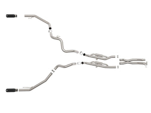 This cat-back exhaust system is constructed of 3 IN mandrel-bent 304 stainless steel tubing for maximum strength and durability. Finishing off this exhaust system are dual 12 IN diameter black 304 stainless steel clamp-on exhaust tips. The tips features a laser etched aFe POWER logo for a unique style. This system produces a powerful sound unleashing all available horsepower and torque. Utilizing a factory style flange and hangers this system is a direct bolt-on system, which requires no cutting or modifications for a hassle-free installation. This system incorporates factory style exhaust valves which use the factory exhaust valve motors (not included). The valves help regulate, direct and control the flow of exhaust gases by opening, closing, or partially obstructing passageways depending on throttle position for maximum performance. State-of-the-art computer-aided design technology is utilized for precise vehicle fitment. 100% MIG-Welded for race-proven strength and durability.